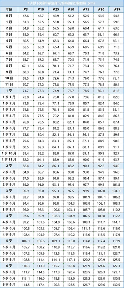 家長可以對照下面由衛健委發布的《7 歲以下兒童生長標準》,根據孩子的性別、年齡,找到孩子身高所處的區間,了解寶寶身高是否達標。