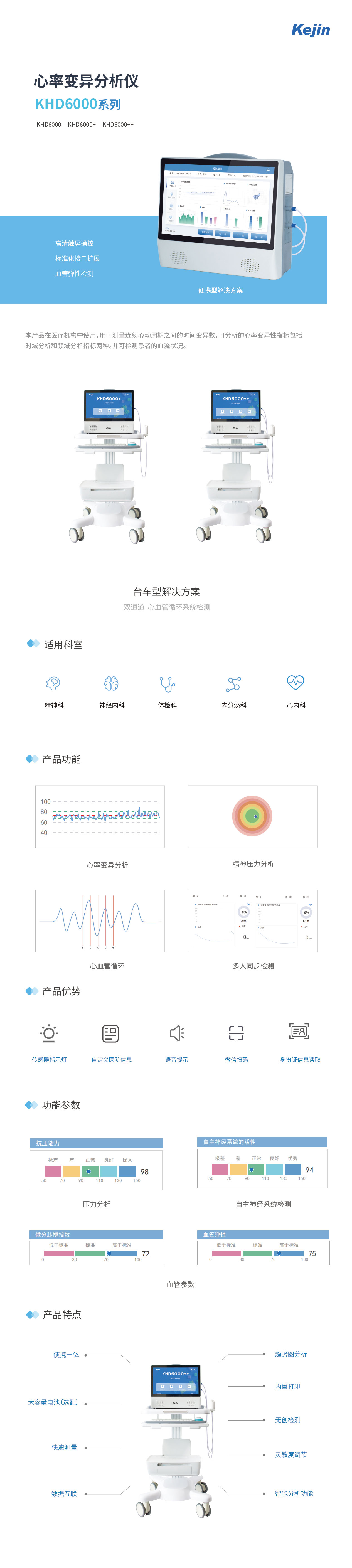 本產品在醫療機構中使用,用于測量連續心動周期之間的時間變異數,可分析的心率變異性指標包括時域分析和頻域分析指標兩種。并可檢測患者的血流狀況。